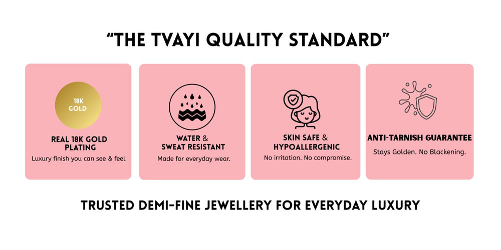 Whether you’re looking for 18K gold plated necklaces, everyday earrings, bracelets, or rings, Tvayi brings you jewellery that combines luxury, durability, and affordability — all in one place.