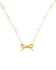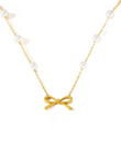 This lightweight 18 carat gold plated bow pearl necklace is a delicate and elegant addition to any jewelry collection. The 18k gold plating adds a touch of sophistication, while the subtle bow design adds a touch of charm. Perfect for any occasion, this necklace will elevate any outfit with its timeless beauty.