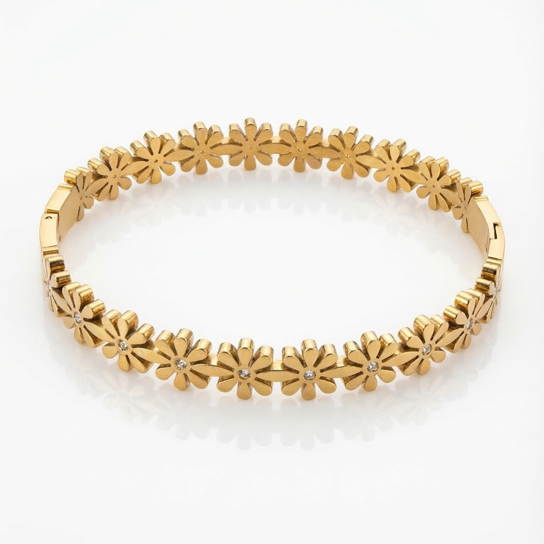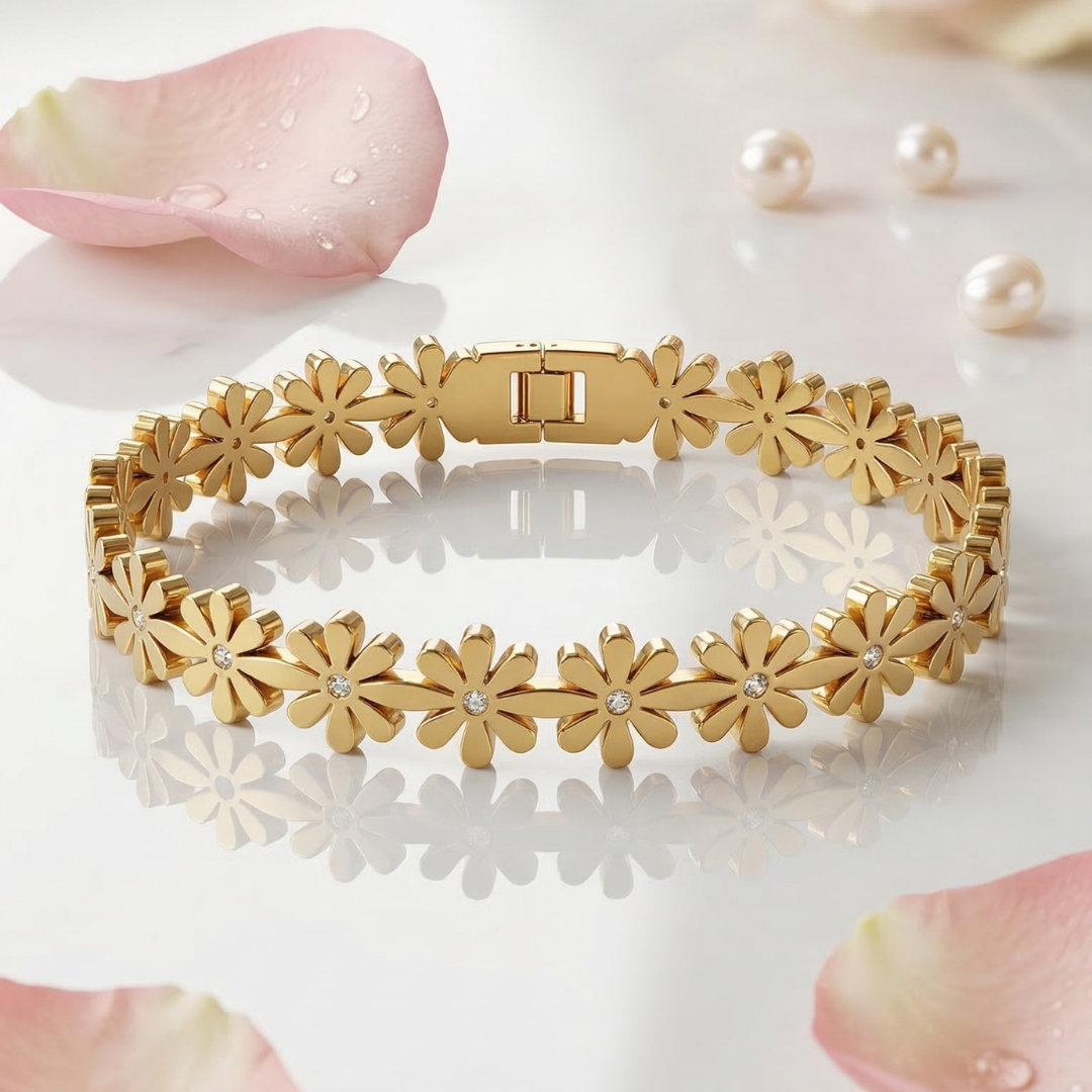 This premium bracelet features polished gold-plated flower motifs with subtle crystal accents at the center, giving it a refined sparkle. The elegant floral design makes it perfect for everyday styling while also adding sophistication to special occasions.